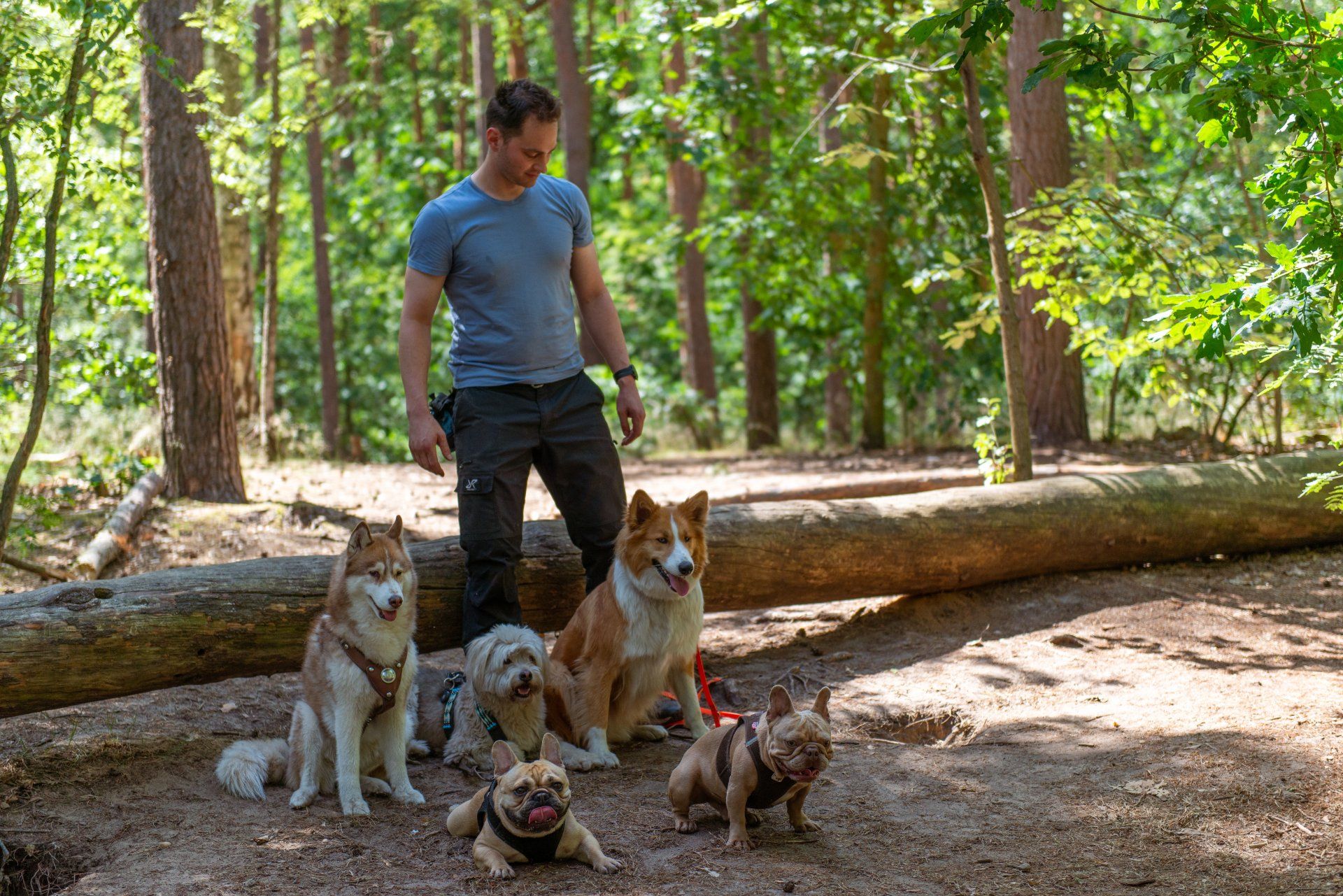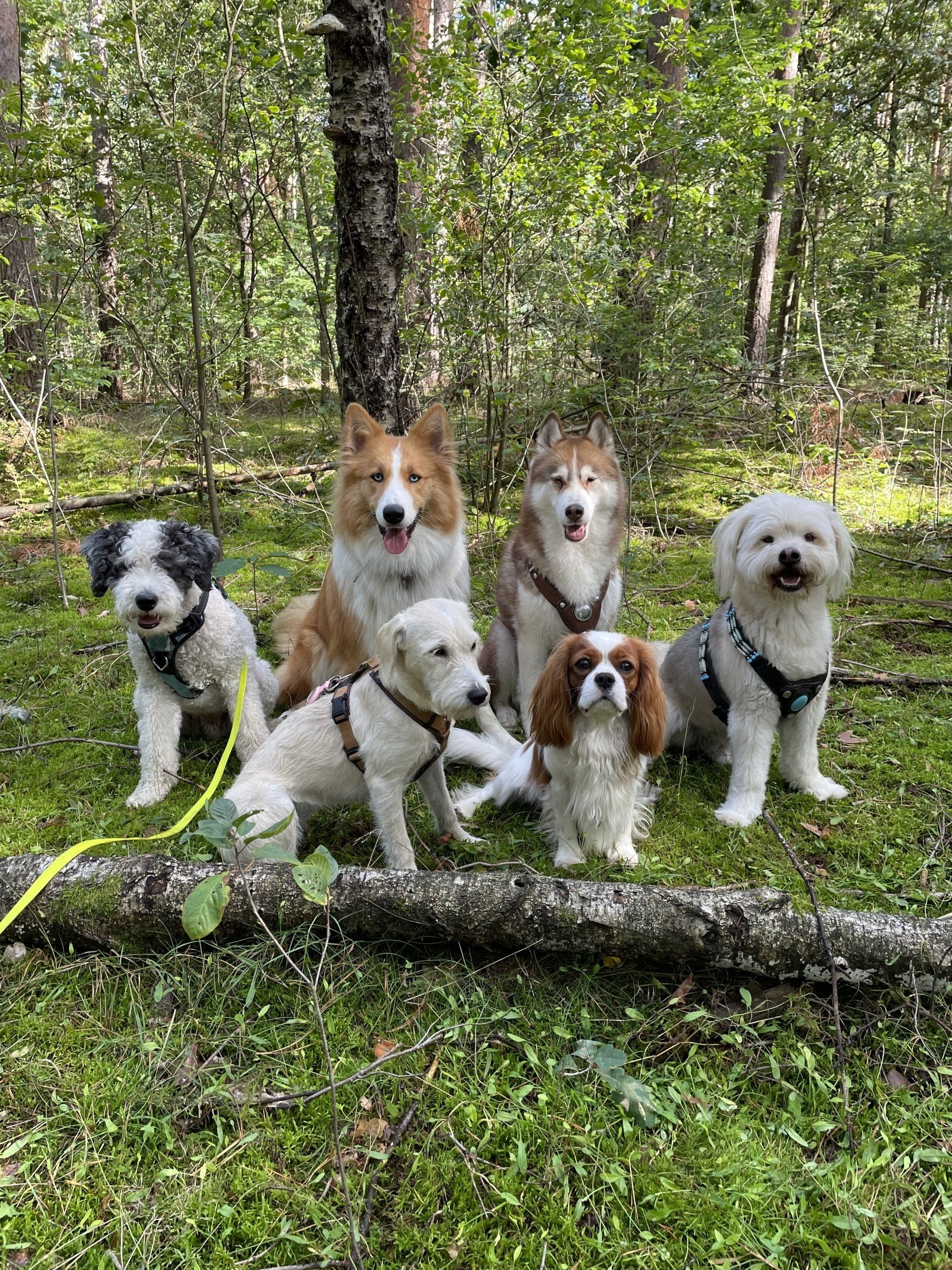 Ich plane jeden Lauf mit mindestens zwei Zeitstunden ein (gerne bin ich auch mal 30min länger unterwegs wenn die Gruppe es zulässt). Im Wald selber führe ich auch Aktivitäten mit der Gruppe durch. Neben Gruppenbildern, wo alle schön brav nebeneinander sitzen sollen und die jeder Besitzer danach auch zugeschickt bekommt, werden auch Leckerli-Suchspiele oder artistische Baumstamm-Balance-Einlagen abgehalten. Ich habe auch immer ausreichend Wasser für alle Hunde dabei (sowie ein Erste-Hilfe-Set für Hunde, sollte sich mal doch ein Vierbeiner verletzen).